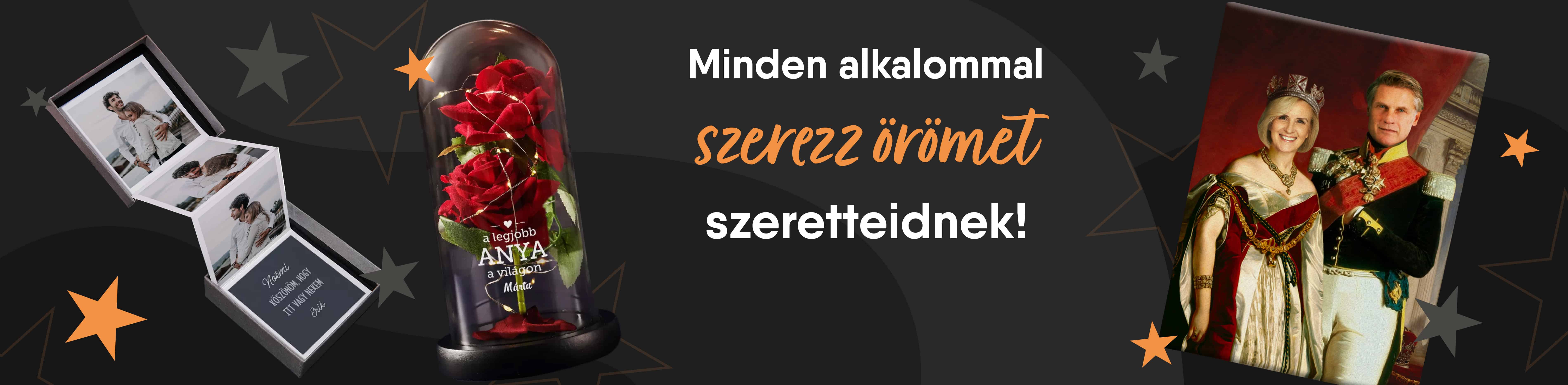Olyan sok alkalom van, hogy - őszintén szólva - valójában akár minden nap lehet ünnepelni valamit. Tagadhatatlan, hogy mindannyian szeretünk ünnepelni, és ilyen gyakoriság mellett nem mindig támad a megfelelő ajándékötlet. Ha nem vesszük figyelembe az olyan alkalmakat, mint például sárgarépanap vagy az elefántok világnapja, még mindig rengeteg van belőlük. Amikor személyre szabott ajándékainkat készítjük, fontosnak tartunk minden lehetőséget, így Te is tökéletesen testre szabhatod az ajándékodat. Különösen akkor, ha sokat kell vásárolnod belőlük, és az idő sürget. Mindannyian tudjuk, hogy valahol november vége körül kezdődik a vásárlási láz. Ekkor bizonyulnak zseniális megoldásnak a személyre szabott online ajándékok. Nálunk az álmaid karácsonyi ajándekát találod. Stressz és gond nélkül választasz ki valamit az egész családod és az összes barátod számára. Akár ha egy különleges, karácsony mintás ajándékötletekről van szó, akár az univerzálisabb, sok alkalomhoz illő ajándékok esetében. Például a névnapok - elvégre minden nap van valaki, aki épp névnapját ünnepli, ugye? Ez egy jó alkalom arra, hogy átböngésszd az online ajándékainkat, és válassz valami egyedit. Gyűjteményünkben eredeti születésnapi ajándékötletek, különleges ajándékok esküvőkre és évfordulókra, bájos csecsebecsék keresztelőre vagy elsőáldozásra találhatóak, és még sok-sok minden más is.Online ajándékok a szeretteidnek