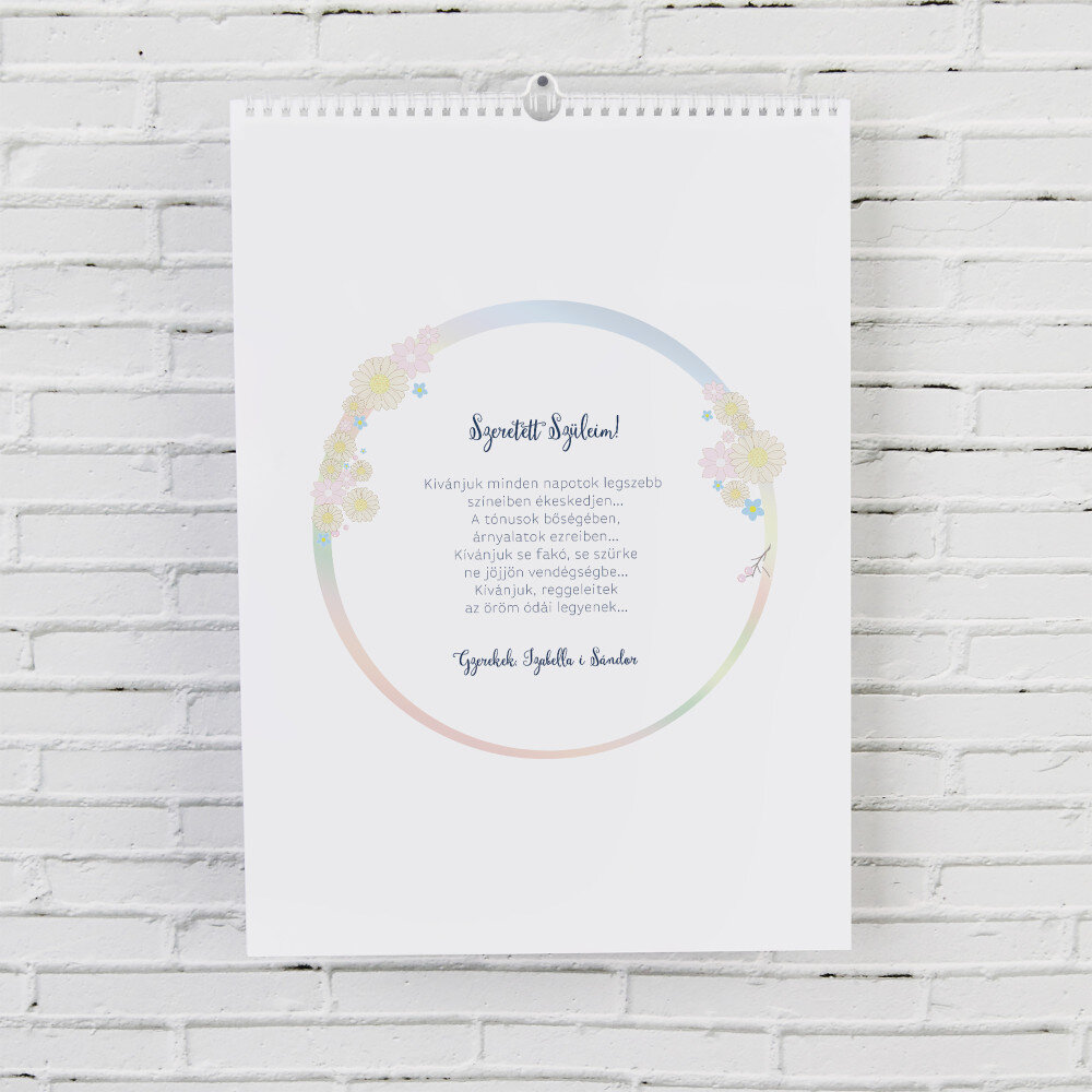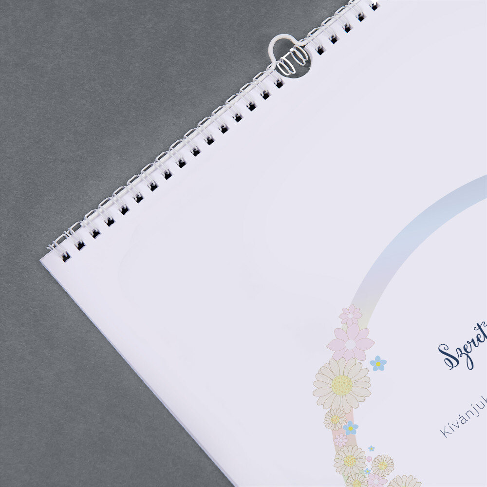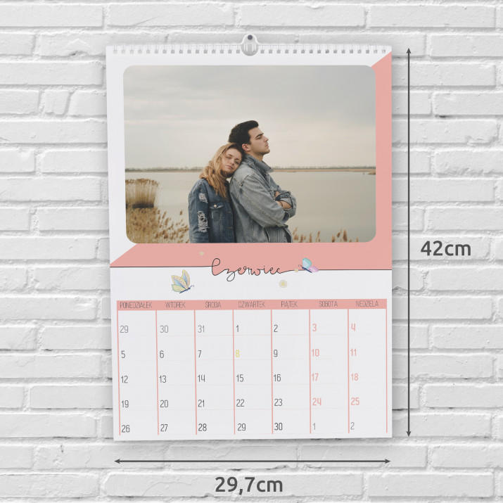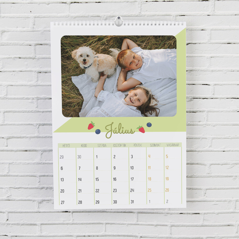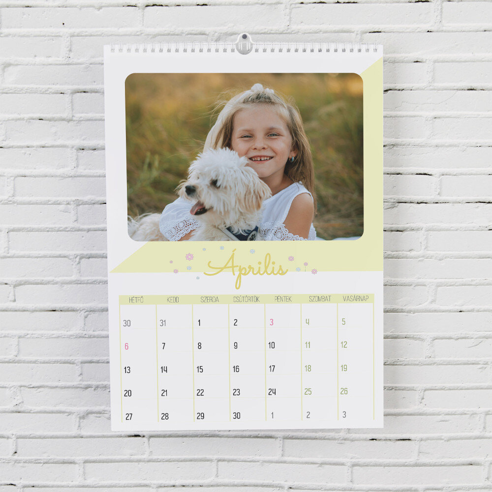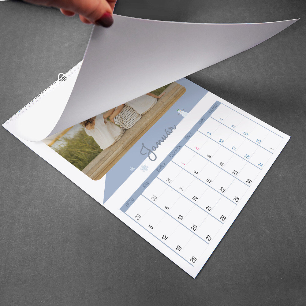 A naptár A3-as formátumban kerül kinyomtatásra.Minden hónap külön, magas minőségű papírból készült lapon van kinyomtatva. A nyomtatás gyönyörű, a színek telítettek, és a hatás tartós. Minden hónaphoz választhatsz egy fényképet, így a naptár mindig nagyszerűen néz ki!
