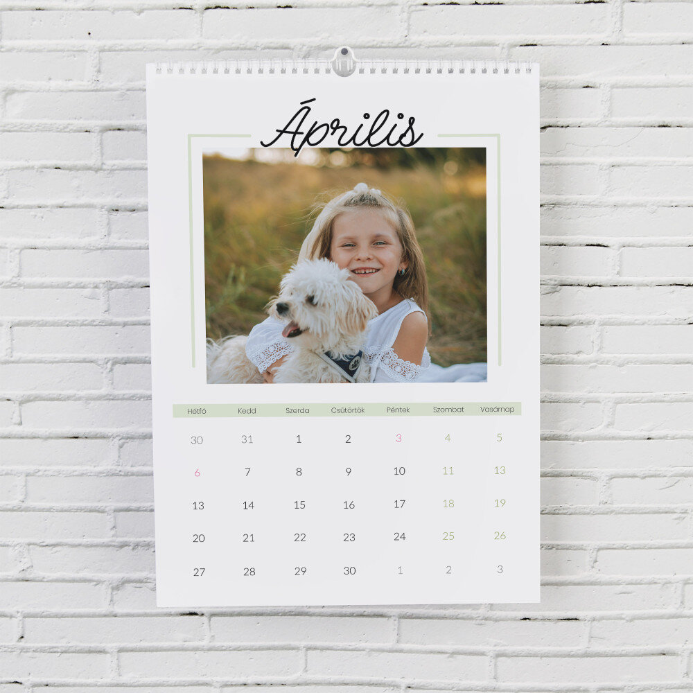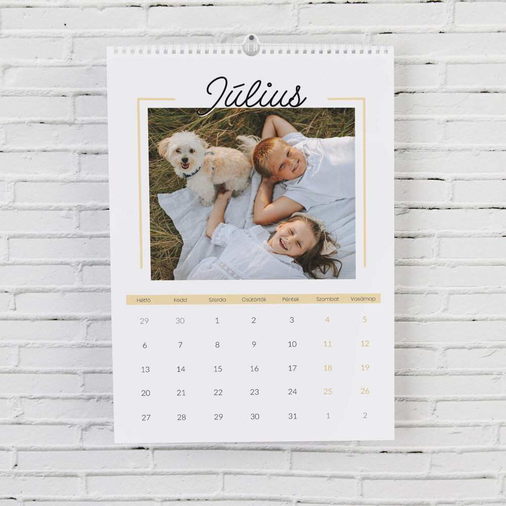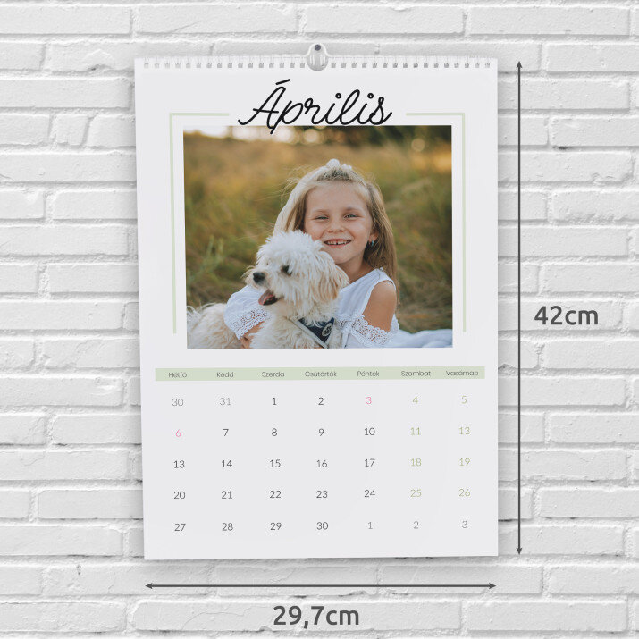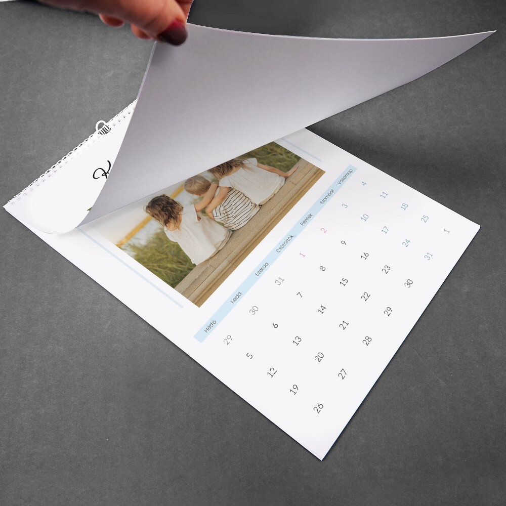 A naptár A3-as formátumban kerül kinyomtatásra.Minden hónap külön, magas minőségű papírból készült lapon van kinyomtatva. A nyomtatás gyönyörű, a színek telítettek, és a hatás tartós. Minden hónaphoz választhatsz egy fényképet, így a naptár mindig nagyszerűen néz ki!