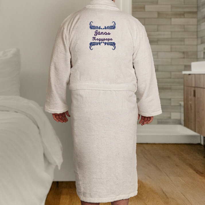 Univerzális, fehér színű fürdőköpeny, 100% pamut frottírból készült. Kényelmes, szép, puha - tökéletes kényelmet nyújt, amikor egy nehéz nap után itt az ideje a pihenésnek. Ébredés után, ha felvesszük rögtön felmelegít. A fürdőköpeny csodaszép egyedi hímzéssel díszítve, javítja a közérzetet, mindezek a fürdőköpenyt még különlegesebb ajándékká teszik!A terméknek elegáns gallérja és zsebei vannak, hogy tündökölhess az otthoni divat, esti bemutatóján. A fürdőköpeny mérete univerzális, a tömege 350 g/m2. Uniszex.
