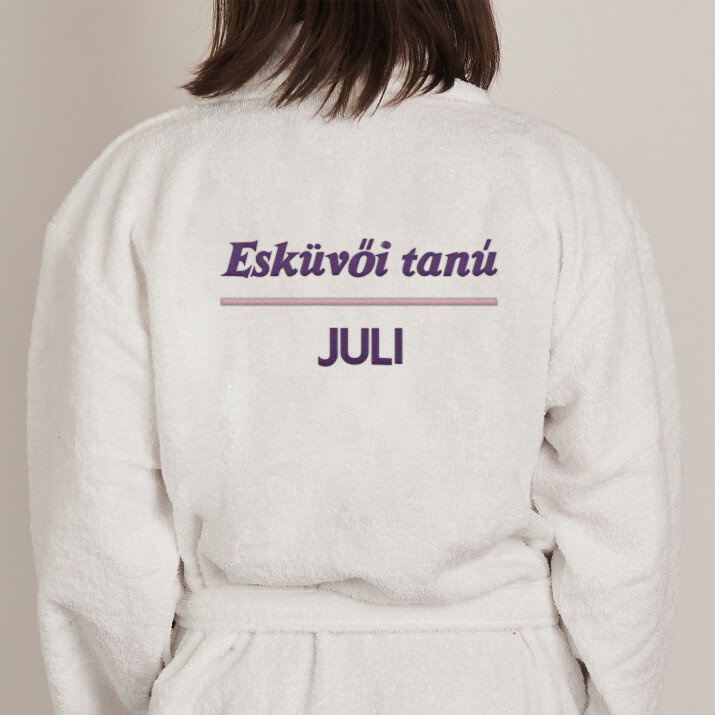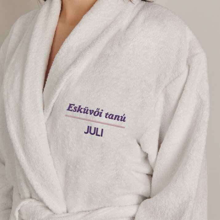 Univerzális, fehér színű fürdőköpeny, 100% pamut frottírból készült. Kényelmes, szép, puha - tökéletes kényelmet nyújt, amikor egy nehéz nap után itt az ideje a pihenésnek. Ébredés után, ha felvesszük rögtön felmelegít. A fürdőköpeny csodaszép egyedi hímzéssel díszítve, javítja a közérzetet, mindezek a fürdőköpenyt még különlegesebb ajándékká teszik!