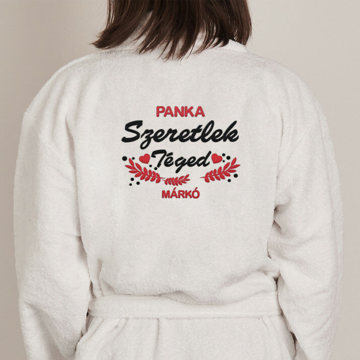 Univerzális, fehér színű fürdőköpeny, 100% pamut frottírból készült. Kényelmes, szép, puha - tökéletes kényelmet nyújt, amikor egy nehéz nap után itt az ideje a pihenésnek. Ébredés után, ha felvesszük rögtön felmelegít. A fürdőköpeny csodaszép egyedi hímzéssel díszítve, javítja a közérzetet, mindezek a fürdőköpenyt még különlegesebb ajándékká teszik!