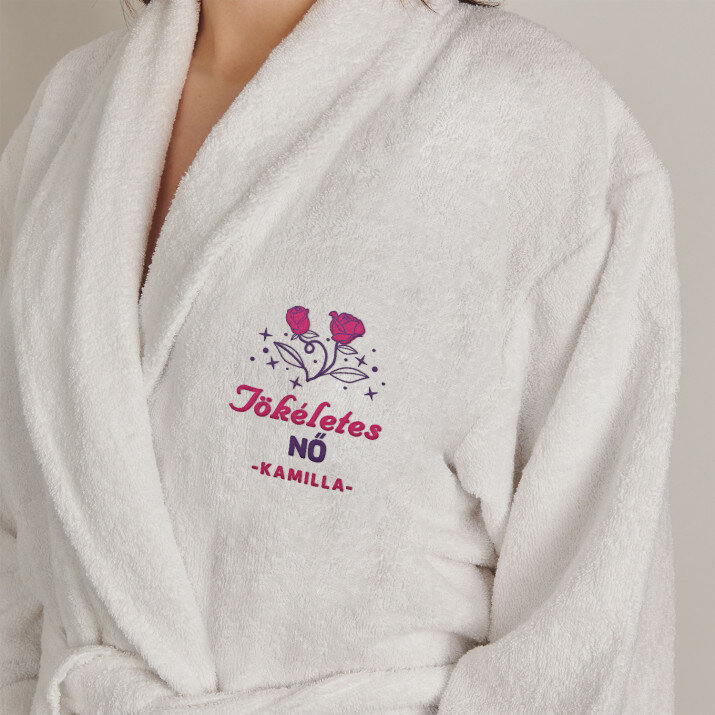 Univerzális, fehér színű fürdőköpeny, 100% pamut frottírból készült. Kényelmes, szép, puha - tökéletes kényelmet nyújt, amikor egy nehéz nap után itt az ideje a pihenésnek. Ébredés után, ha felvesszük rögtön felmelegít. A fürdőköpeny csodaszép egyedi hímzéssel díszítve, javítja a közérzetet, mindezek a fürdőköpenyt még különlegesebb ajándékká teszik!A terméknek elegáns gallérja és zsebei vannak, hogy tündökölhess az otthoni divat, esti bemutatóján. A fürdőköpeny mérete univerzális, a tömege 350 g/m2. Uniszex.