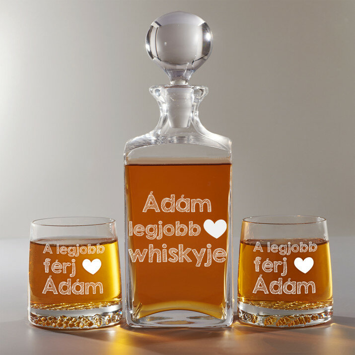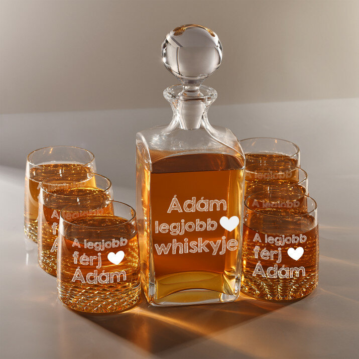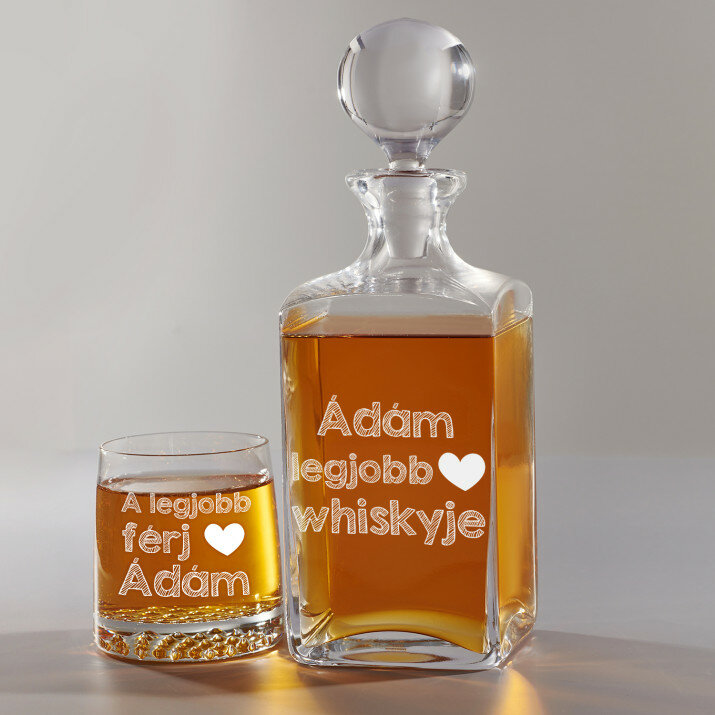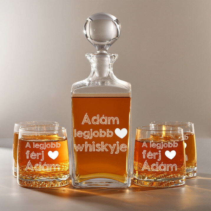 4 vátozatban rendelhető gravírozott whisky dekantáló és poharak készlete:Dekantáló + 1 pohár