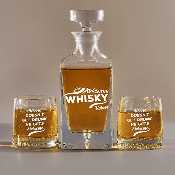 4 vátozatban rendelhető gravírozott whisky dekantáló és poharak készlete:Dekantáló + 1 pohár