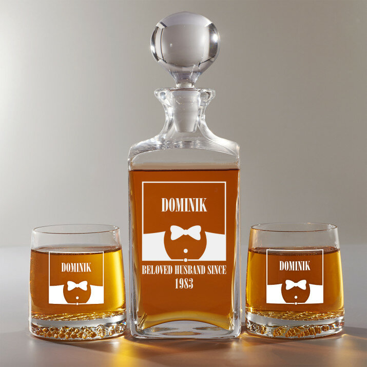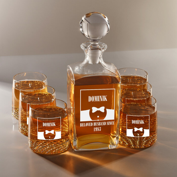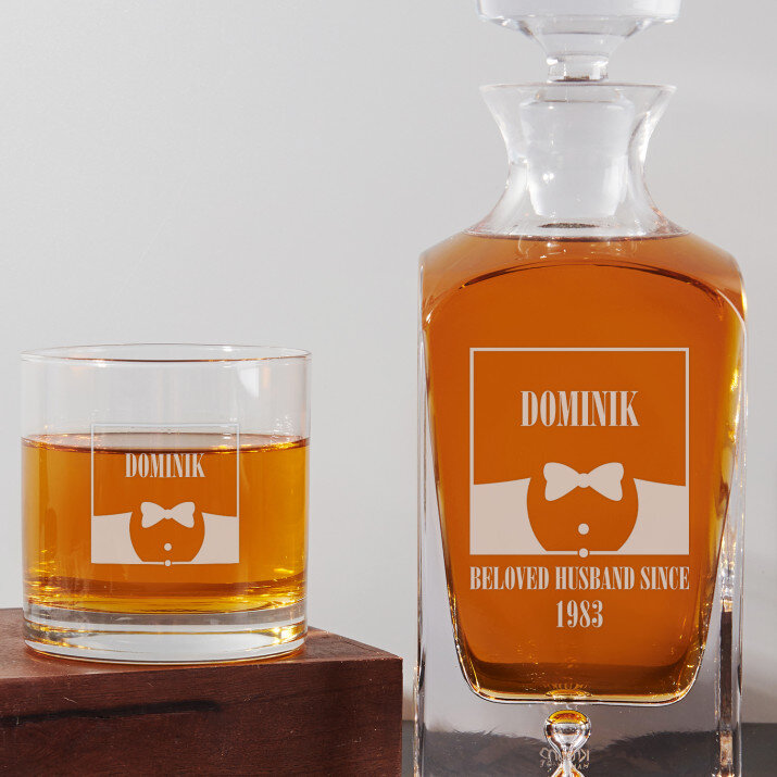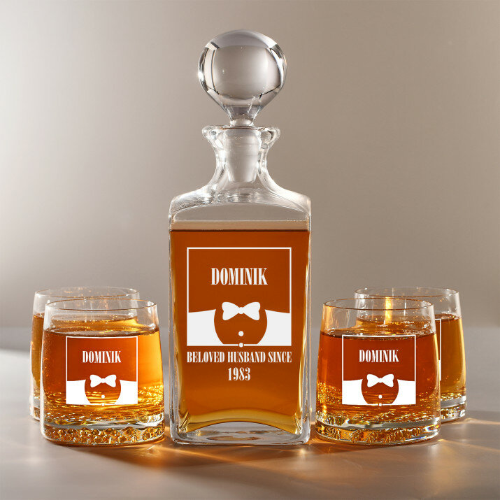 4 vátozatban rendelhető gravírozott whisky dekantáló és poharak készlete:Dekantáló + 1 pohár