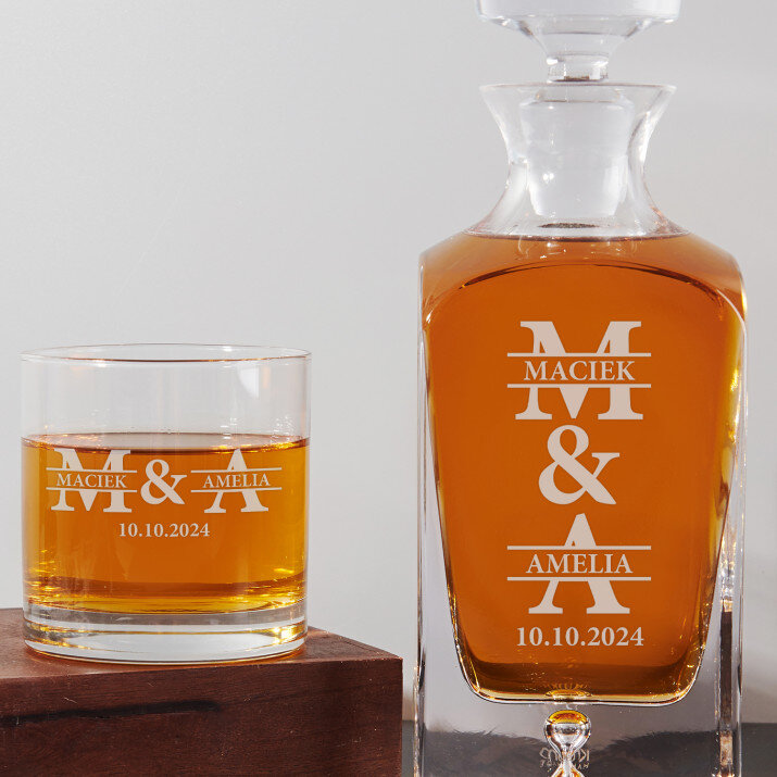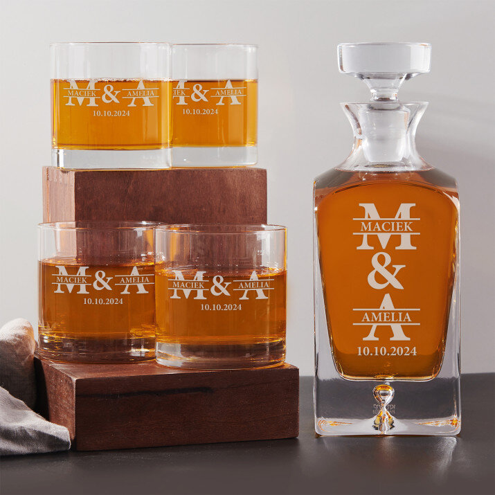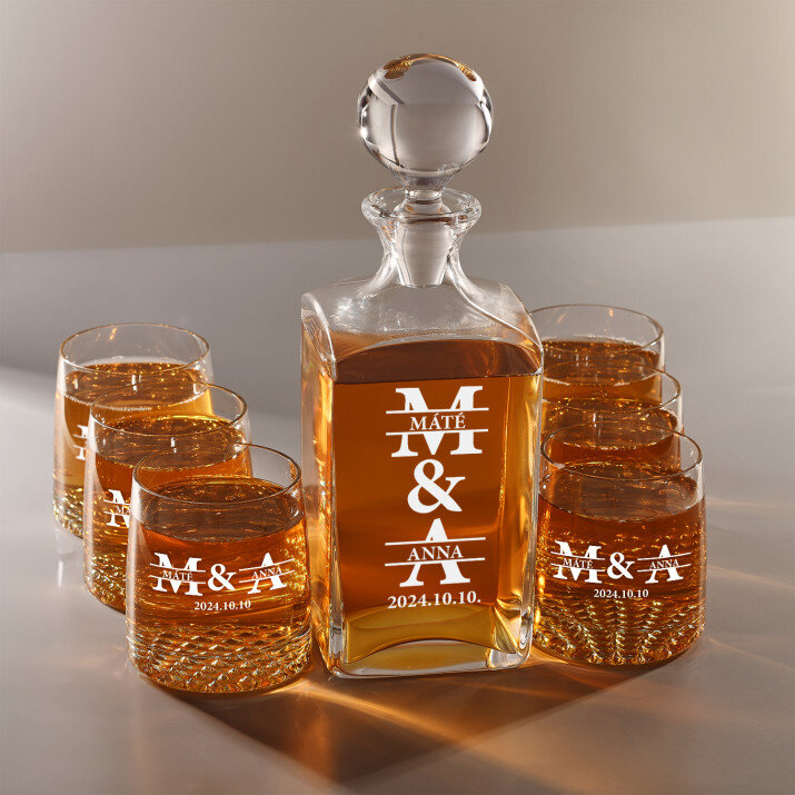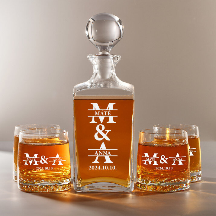 4 vátozatban rendelhető gravírozott whisky dekantáló és poharak készlete:Dekantáló + 1 pohár
