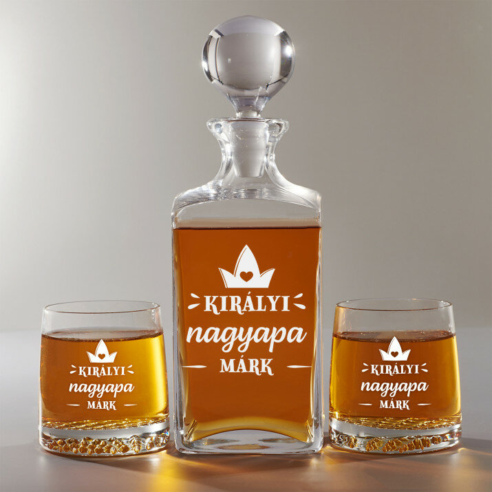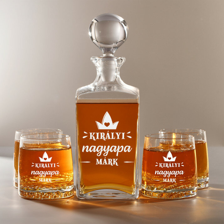 4 vátozatban rendelhető gravírozott whisky dekantáló és poharak készlete: