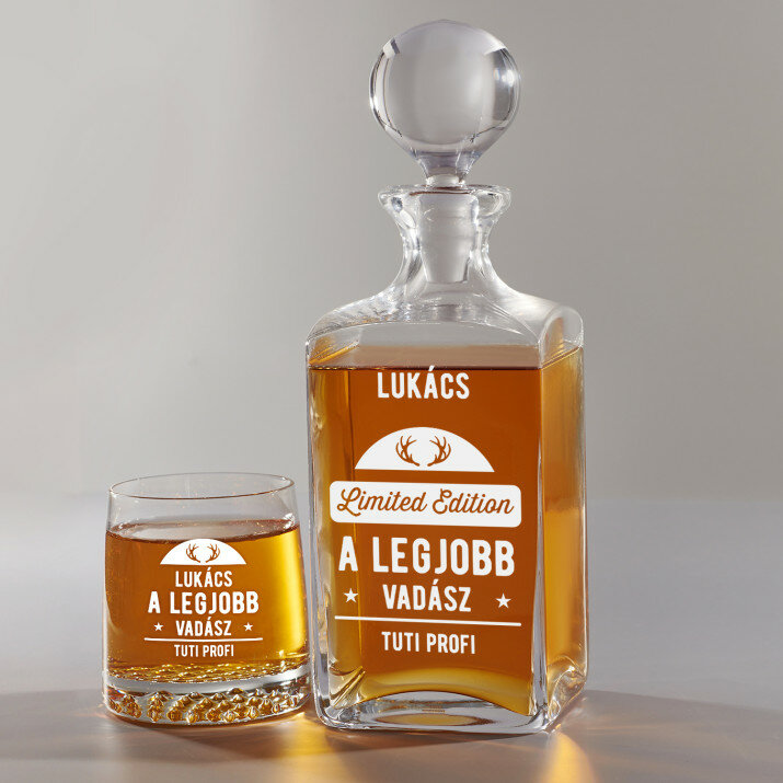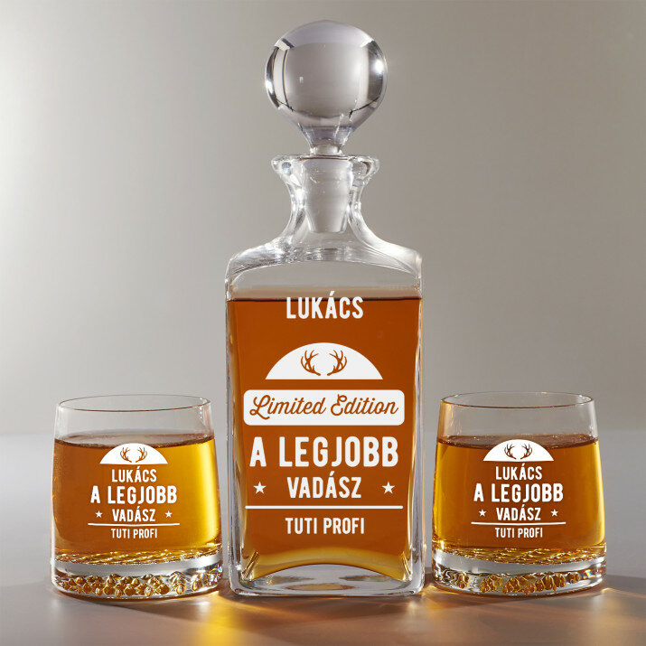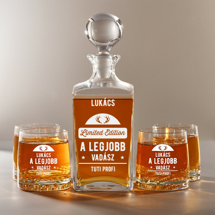 4 vátozatban rendelhető gravírozott whisky dekantáló és poharak készlete:Dekantáló + 1 pohár
