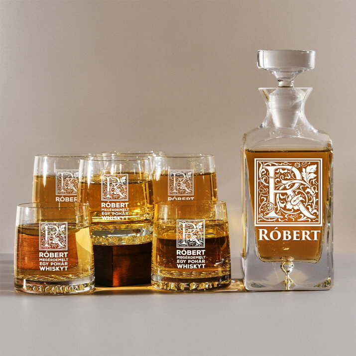 4 vátozatban rendelhető gravírozott whisky dekantáló és poharak készlete:Dekantáló + 1 pohár