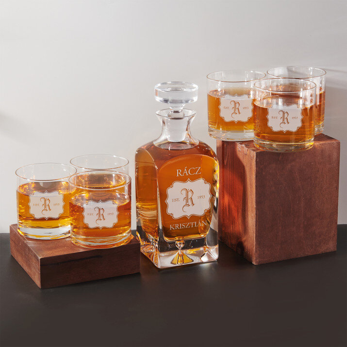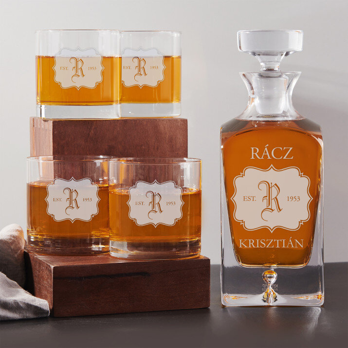 4 vátozatban rendelhető gravírozott whisky dekantáló és poharak készlete:Dekantáló + 1 pohár