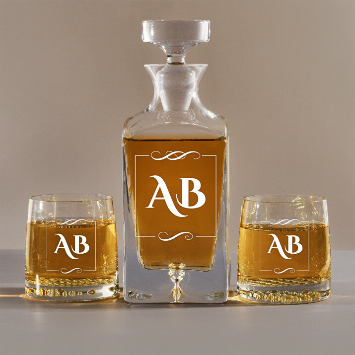 4 vátozatban rendelhető gravírozott whisky dekantáló és poharak készlete:Dekantáló + 1 pohár