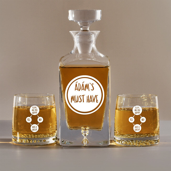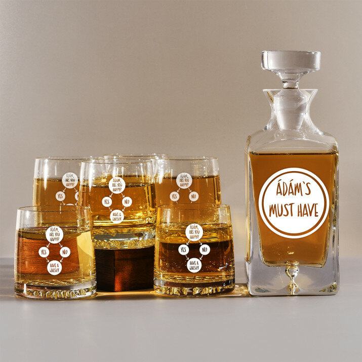 4 vátozatban rendelhető gravírozott whisky dekantáló és poharak készlete:Dekantáló + 1 pohár