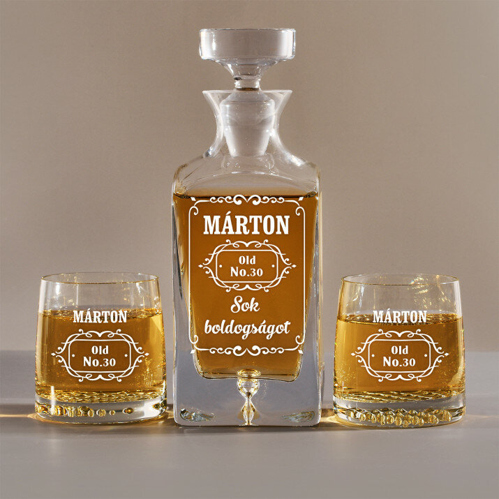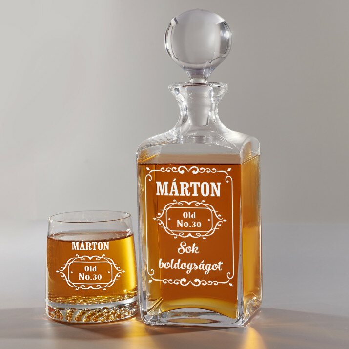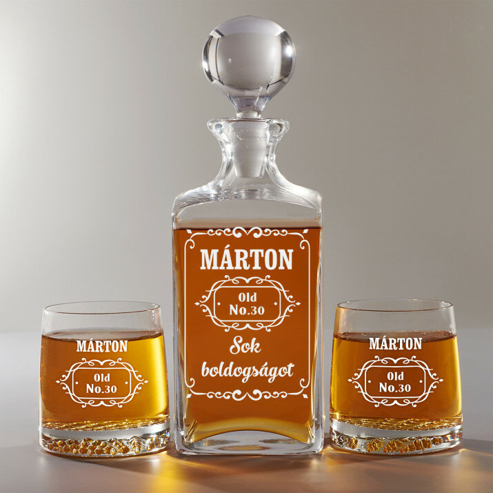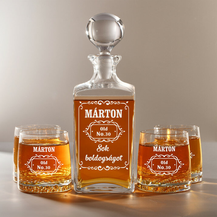 4 vátozatban rendelhető gravírozott whisky dekantáló és poharak készlete:Dekantáló + 1 pohár