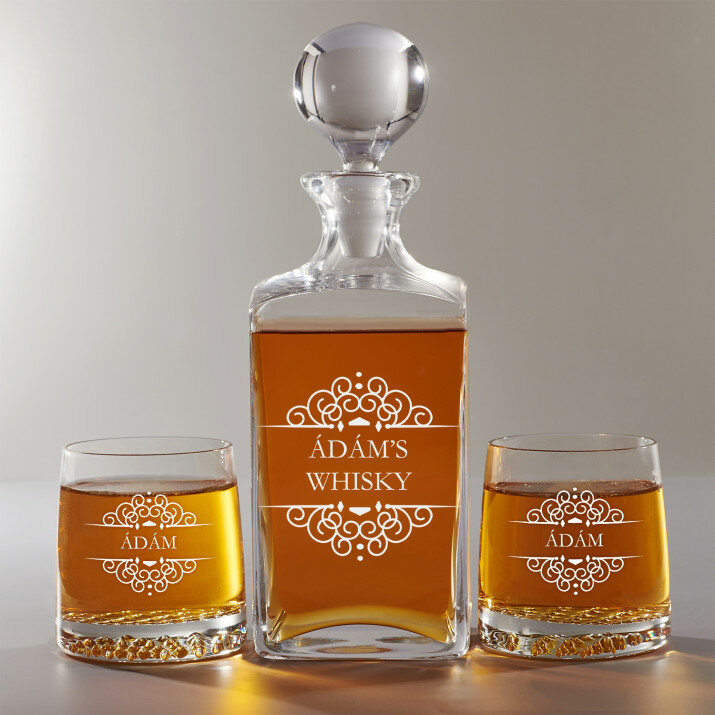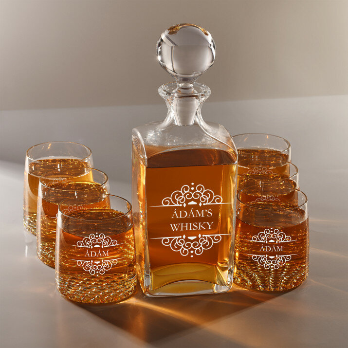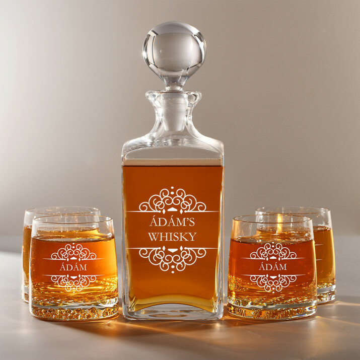 4 vátozatban rendelhető gravírozott whisky dekantáló és poharak készlete:Dekantáló + 1 pohár