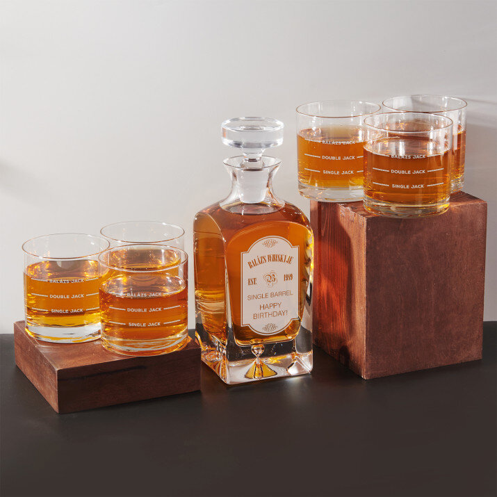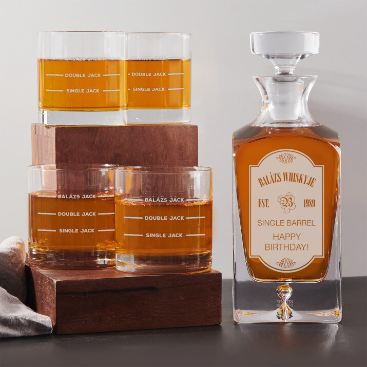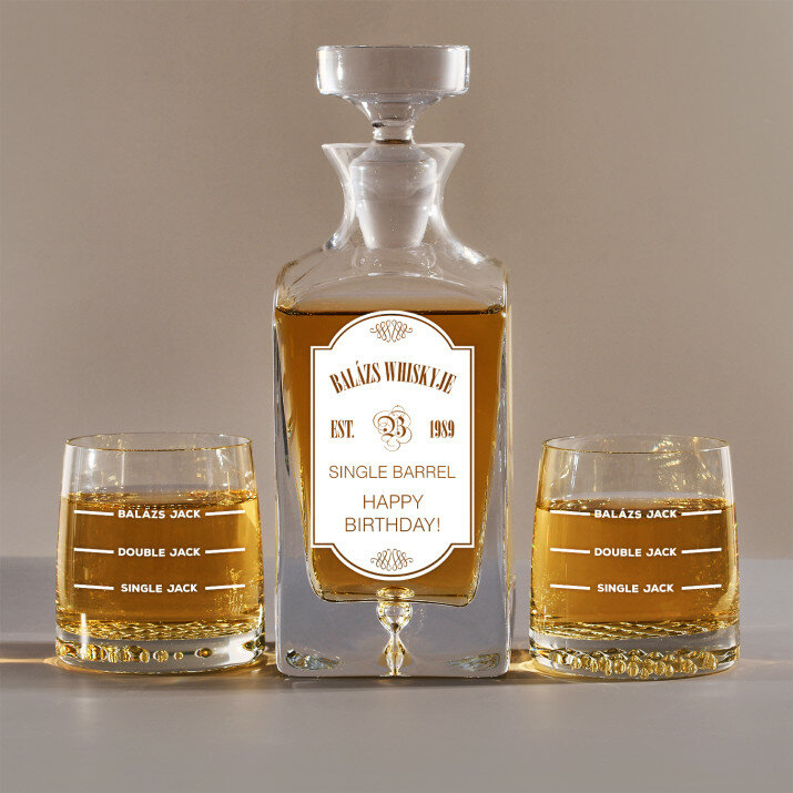 4 vátozatban rendelhető gravírozott whisky dekantáló és poharak készlete:Dekantáló + 1 pohár