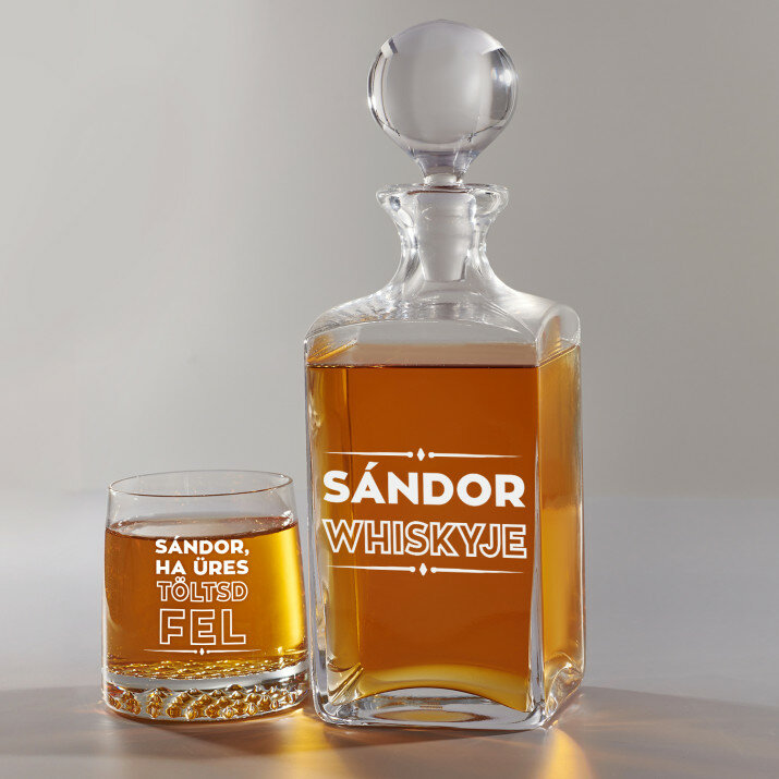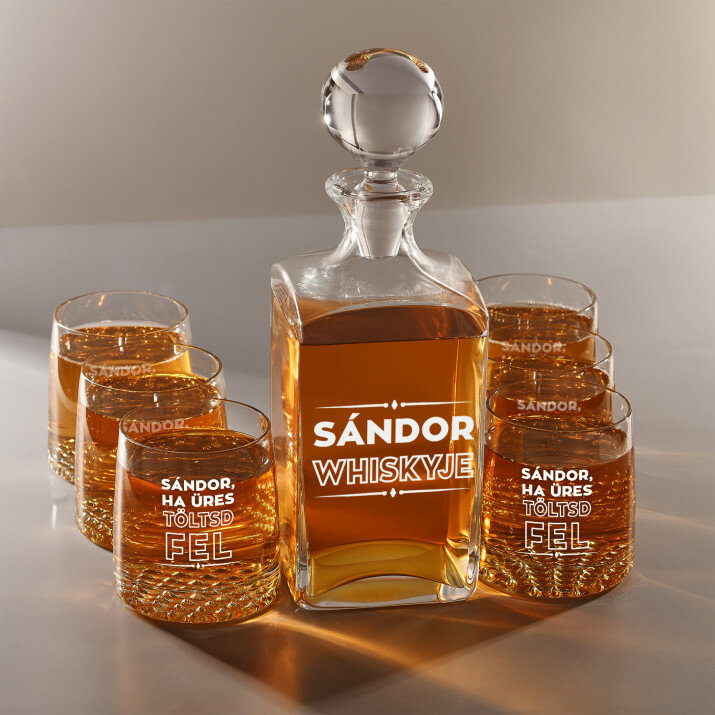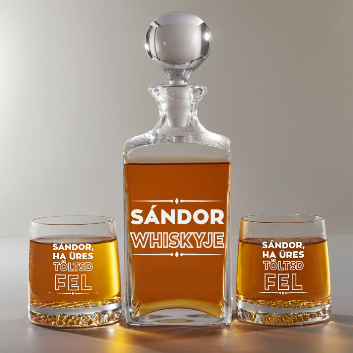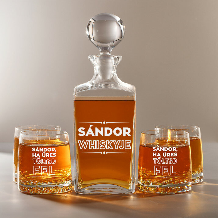 4 vátozatban rendelhető gravírozott whisky dekantáló és poharak készlete:Dekantáló + 1 pohár