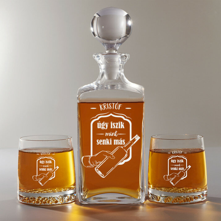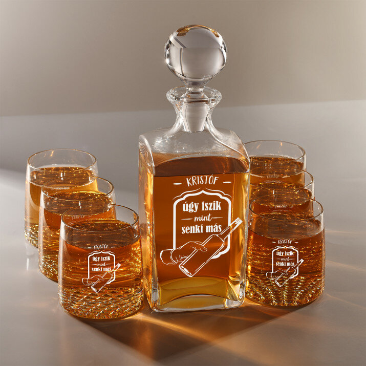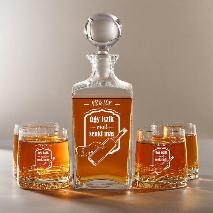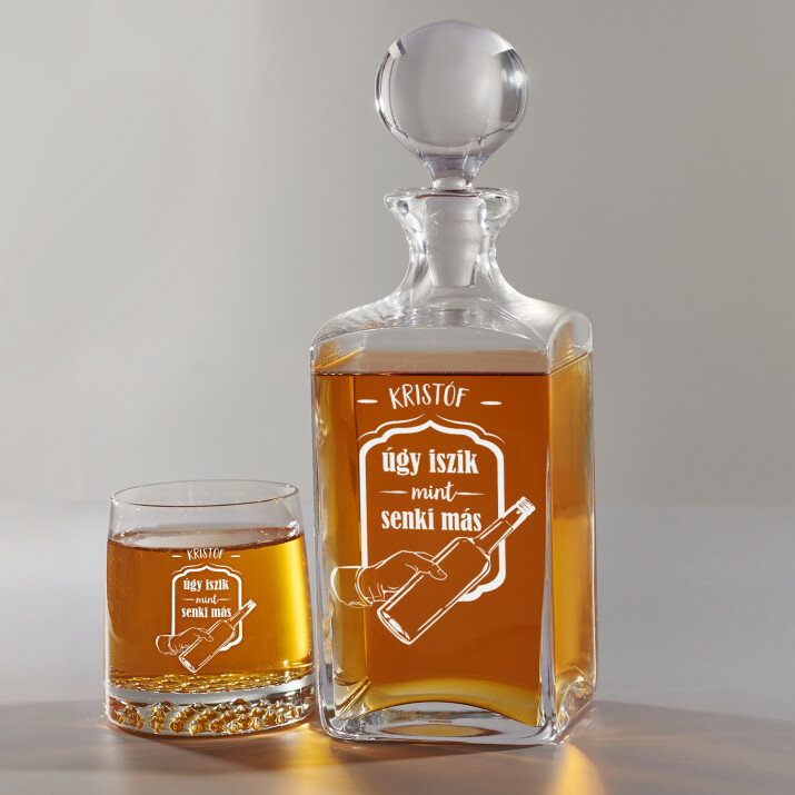4 vátozatban rendelhető gravírozott whisky dekantáló és poharak készlete:Dekantáló + 1 pohár