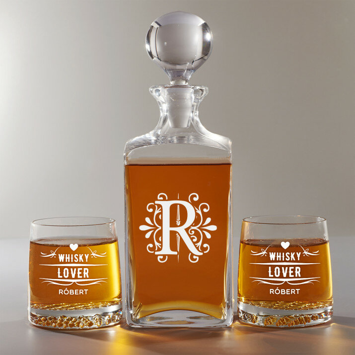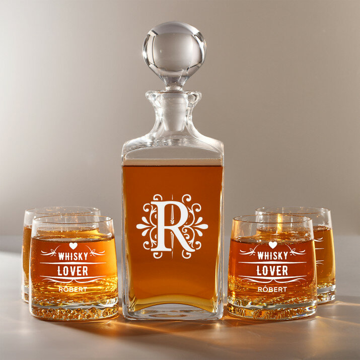 4 vátozatban rendelhető gravírozott whisky dekantáló és poharak készlete:Dekantáló + 1 pohár