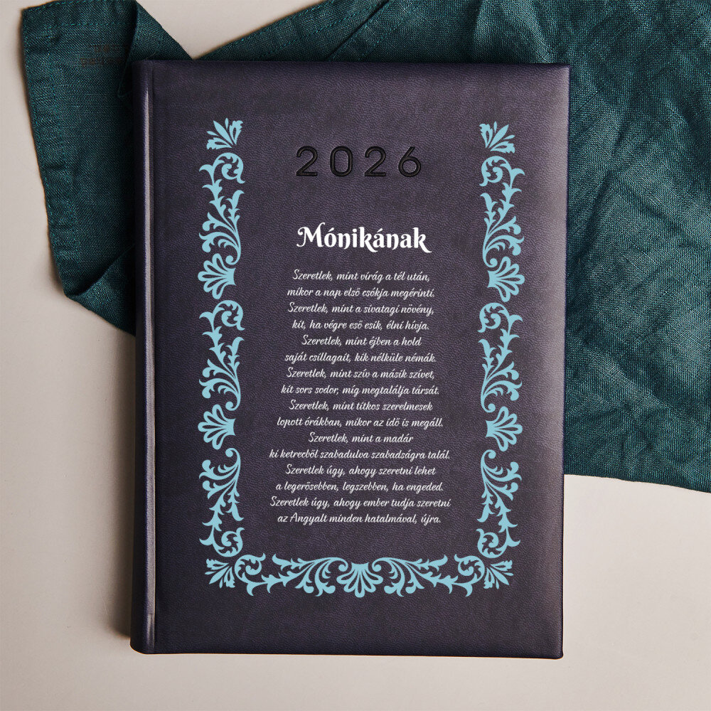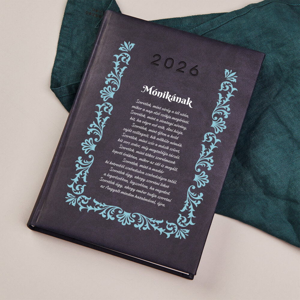 Kiváló minőségű, A5-ös naptár.A borító bársonyos tapintású, matt felületű, selymesen puha anyagból készült.