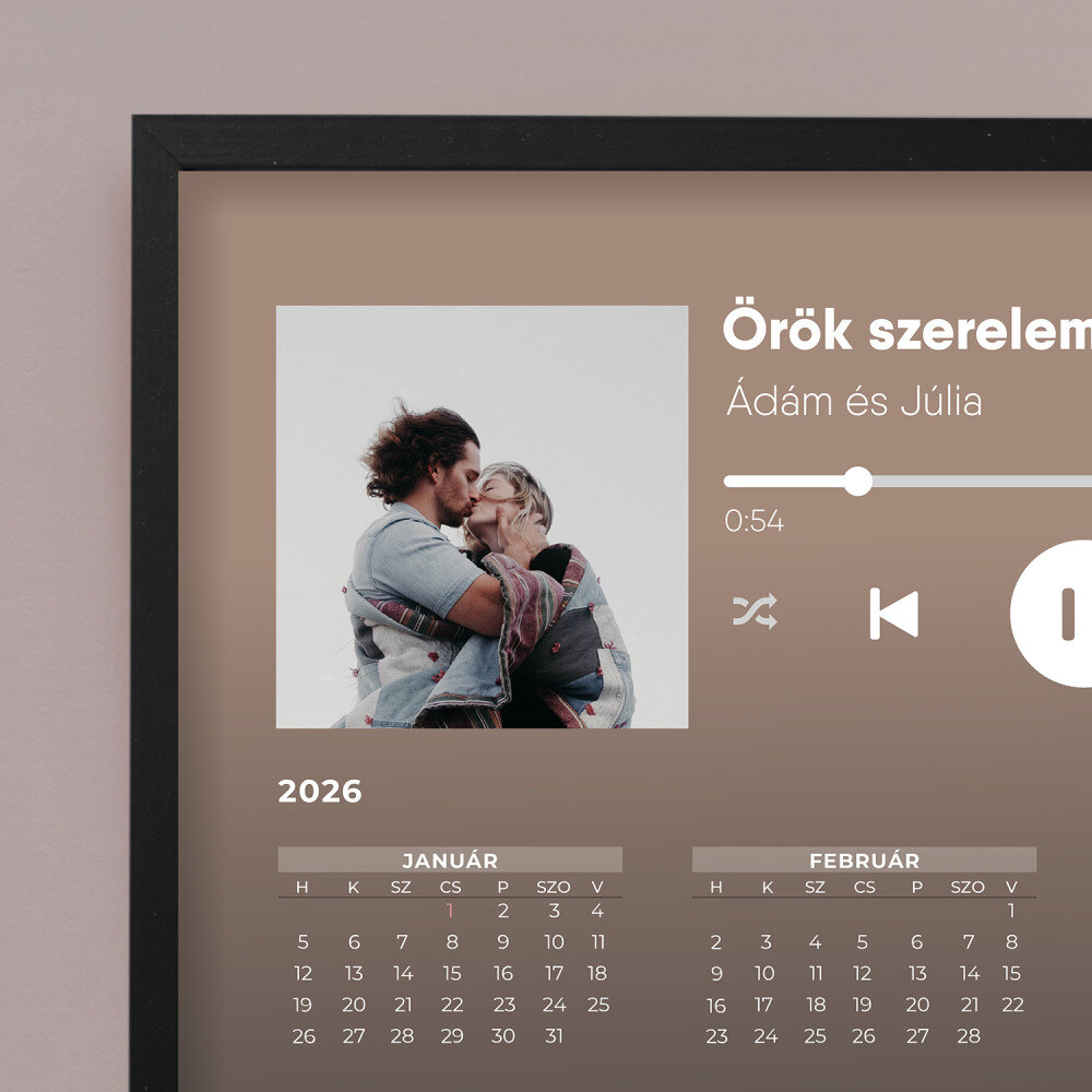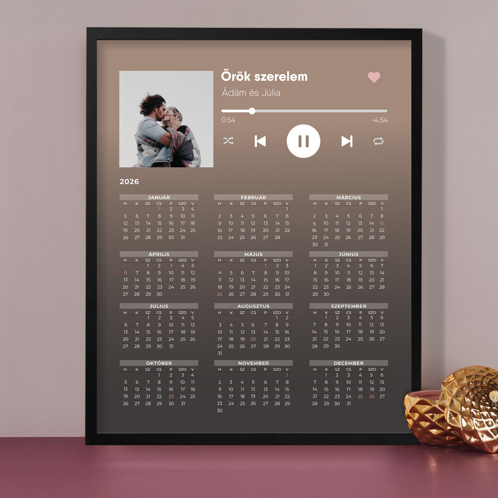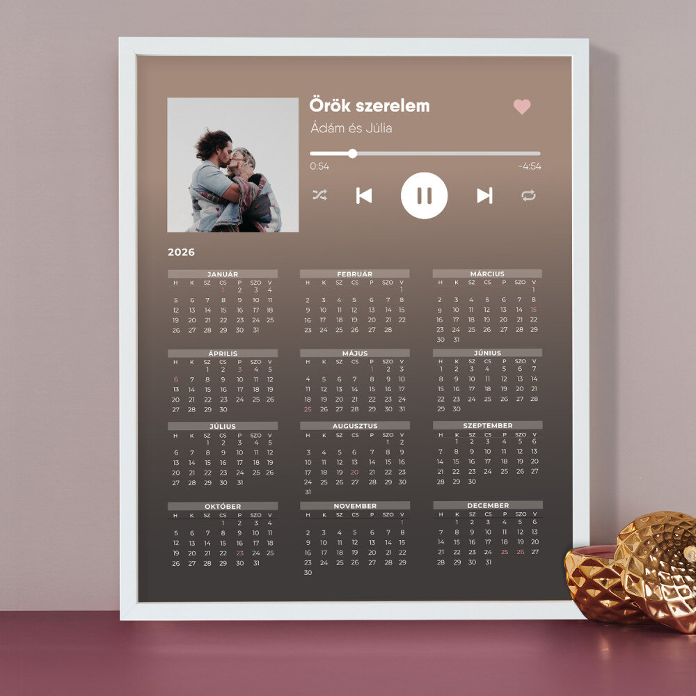 A személyre szabott, bekeretezett naptár remek ajándék ötlet, amely minden belső térhez tökéletes! Az egész év egy oldalra került, így az összes hónap napjai egyben láthatóak. A fotópapírra készült nyomat gyönyörű, a színek telítettek és a kiváló minősége miatt, tartósan megmaradnak. Tökéletes ajándék és egyben maradandó emlék is!A termék méretei: 40 x 50 cm