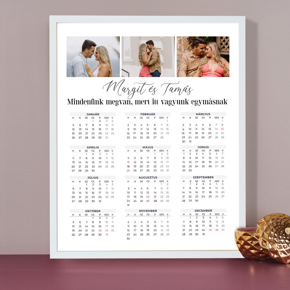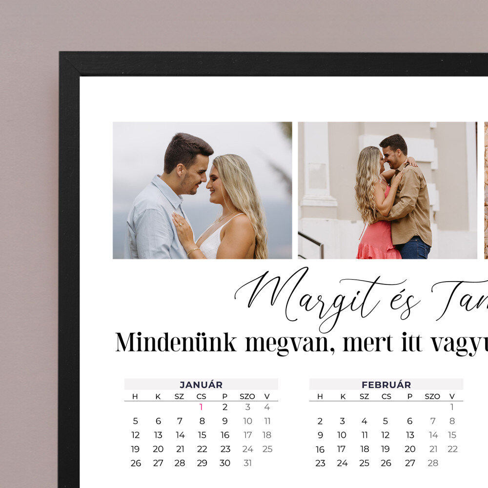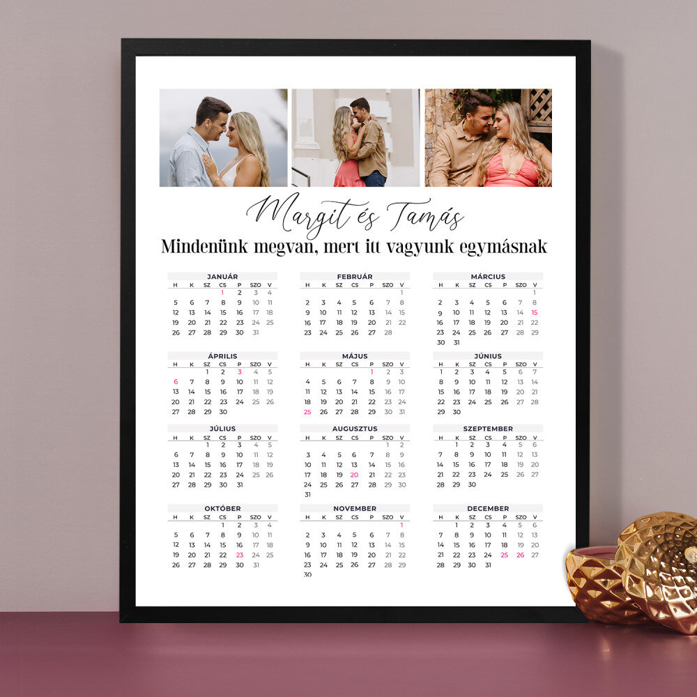 A személyre szabott, bekeretezett naptár remek ajándék ötlet, amely minden belső térhez tökéletes! Az egész év egy oldalra került, így az összes hónap napjai egyben láthatóak. A fotópapírra készült nyomat gyönyörű, a színek telítettek és a kiváló minősége miatt, tartósan megmaradnak. Tökéletes ajándék és egyben maradandó emlék is!A termék méretei: 40 x 50 cm