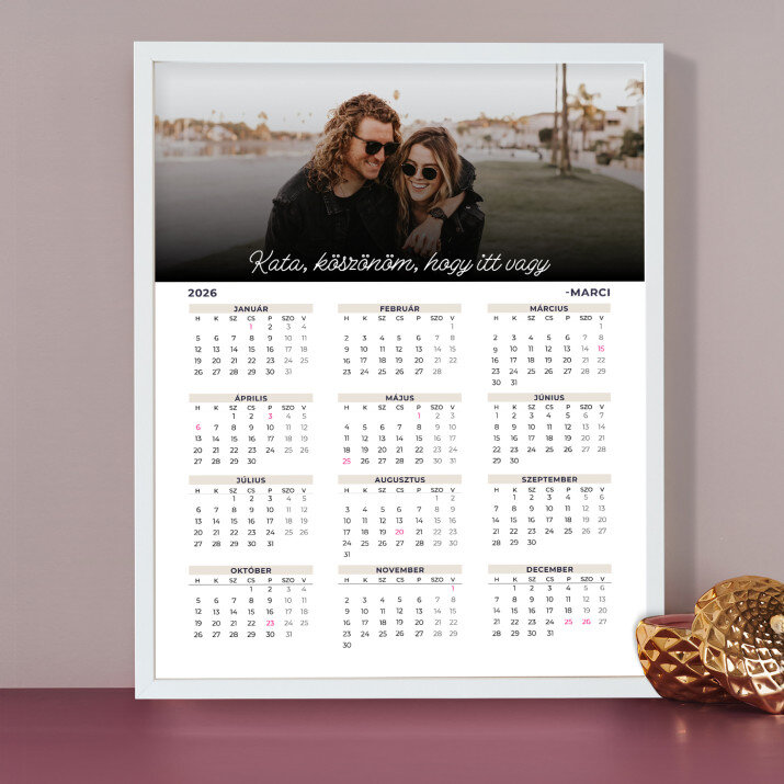 A személyre szabott, bekeretezett naptár remek ajándék ötlet, amely minden belső térhez tökéletes! Az egész év egy oldalra került, így az összes hónap napjai egyben láthatóak. A fotópapírra készült nyomat gyönyörű, a színek telítettek és a kiváló minősége miatt, tartósan megmaradnak. Tökéletes ajándék és egyben maradandó emlék is!A termék méretei: 40 x 50 cm