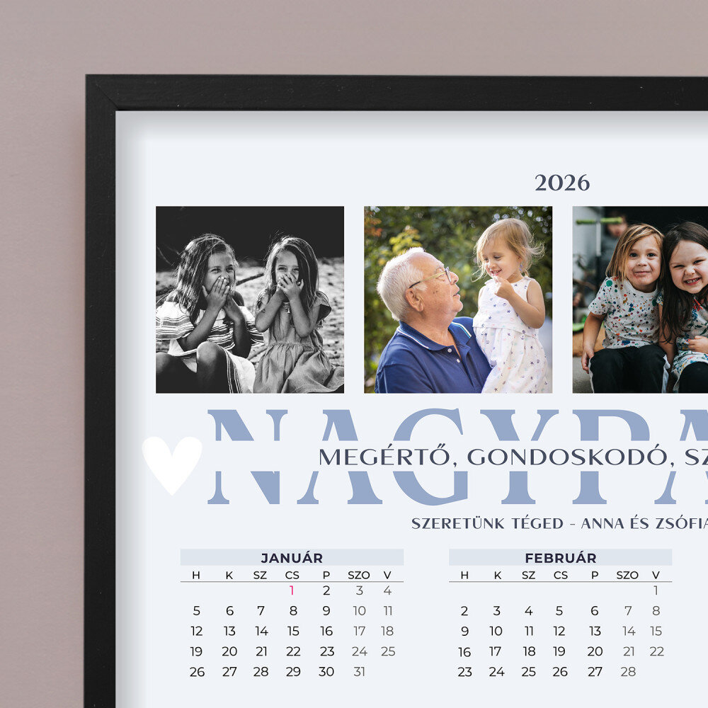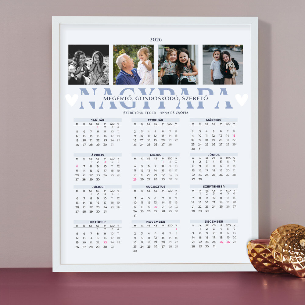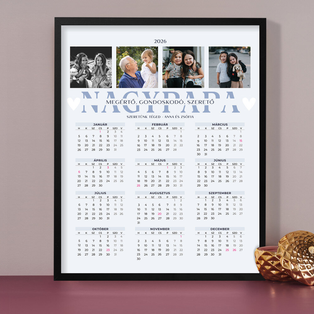 A személyre szabott, bekeretezett naptár remek ajándék ötlet, amely minden belső térhez tökéletes! Az egész év egy oldalra került, így az összes hónap napjai egyben láthatóak. A fotópapírra készült nyomat gyönyörű, a színek telítettek és a kiváló minősége miatt, tartósan megmaradnak. Tökéletes ajándék és egyben maradandó emlék is!A termék méretei: 40 x 50 cm