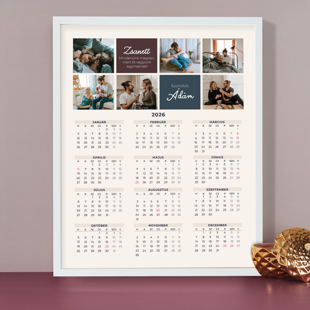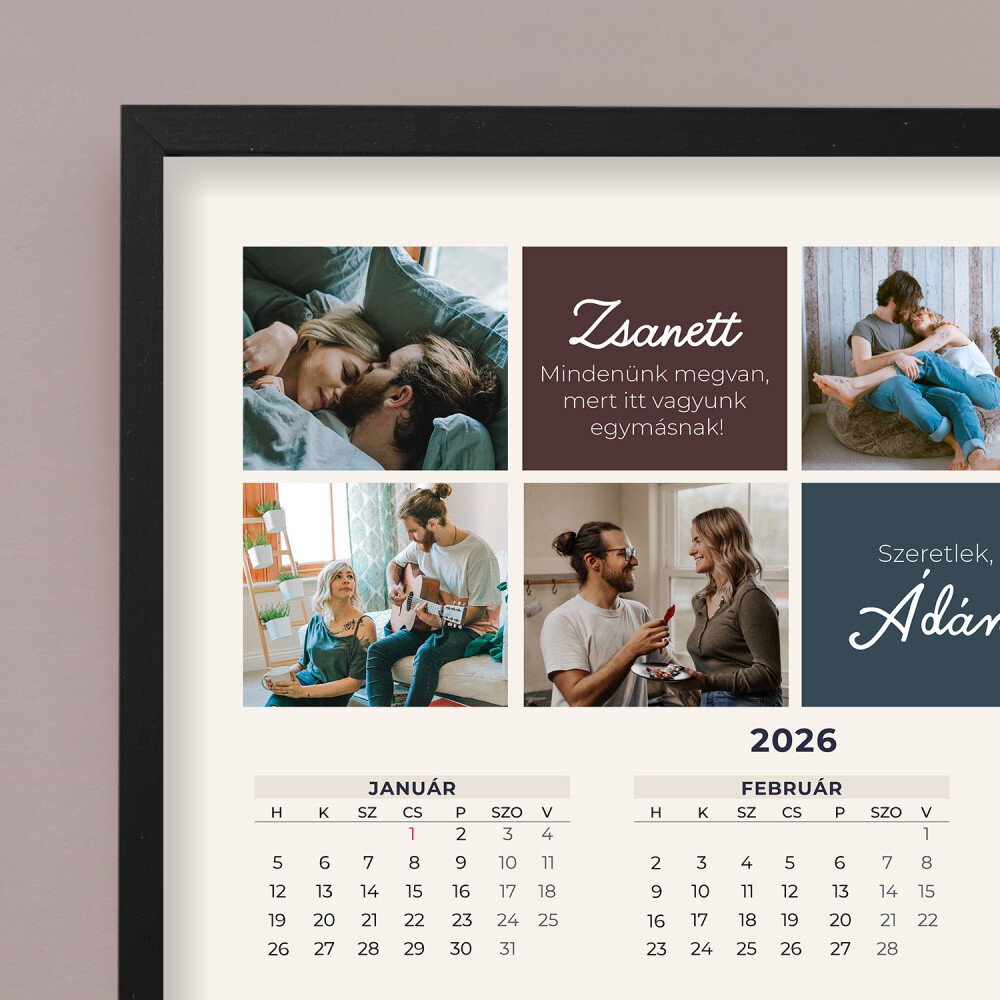 A személyre szabott, bekeretezett naptár remek ajándék ötlet, amely minden belső térhez tökéletes! Az egész év egy oldalra került, így az összes hónap napjai egyben láthatóak. A fotópapírra készült nyomat gyönyörű, a színek telítettek és a kiváló minősége miatt, tartósan megmaradnak. Tökéletes ajándék és egyben maradandó emlék is!A termék méretei: 40 x 50 cm