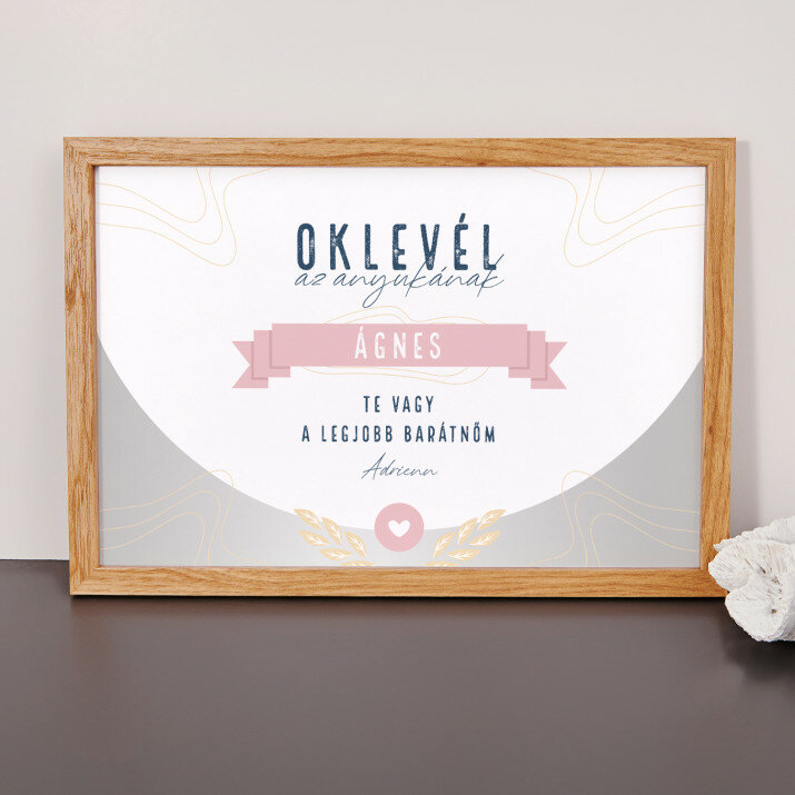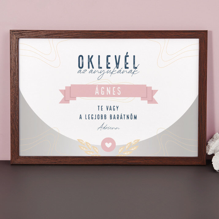 Az oklevél 20x30cm méretű fotópapírra van kinyomtatva és elegáns, 20x30cm méretű keretbe foglalva.