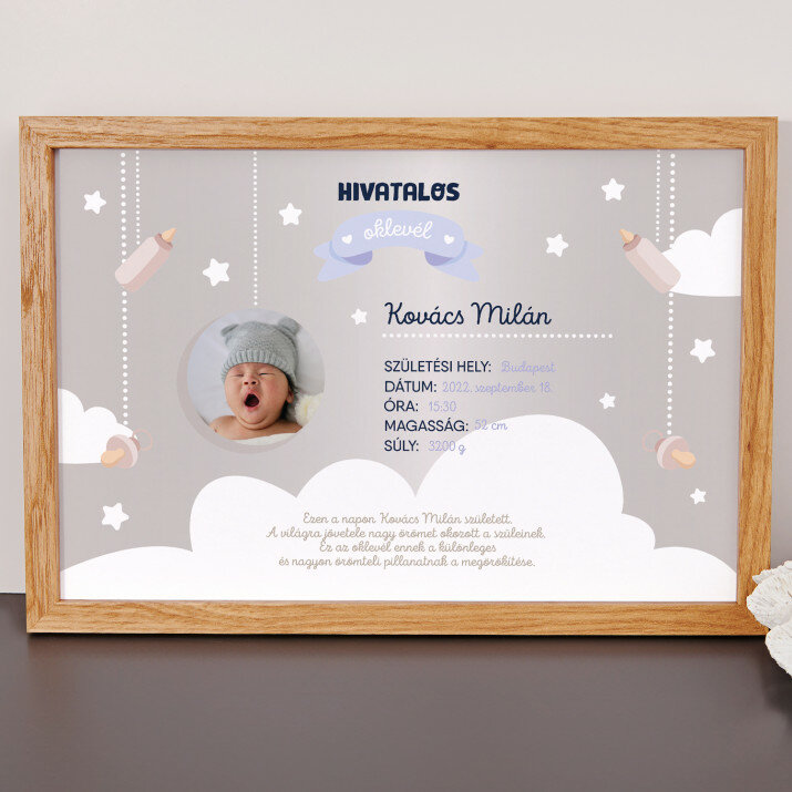 Az oklevél 20x30cm méretű fotópapírra van kinyomtatva és elegáns, 20x30cm méretű keretbe foglalva.