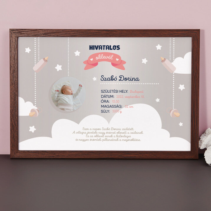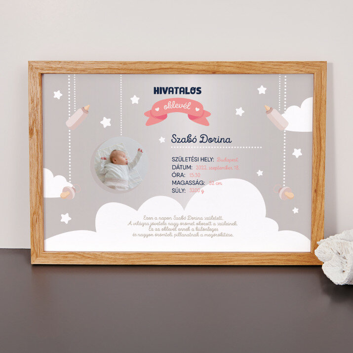 Az oklevél 20x30cm méretű fotópapírra van kinyomtatva és elegáns, 20x30cm méretű keretbe foglalva.