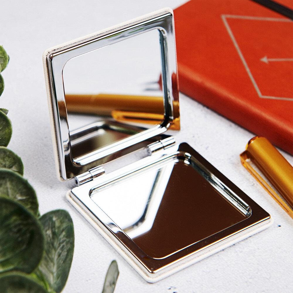 Zsebméretű, törhetetlen tükör polírozott fémből, fehér színű ökológiai bőrrel borítva. Az egyik tükör normál, és a másik nagyítóval rendelkezik, így az egész minden körülmények között kényelmesen használható. Az elegáns, időtlen dizájn minden ízlést eltalál. A női kézitáskák elengedhetetlen kelléke.