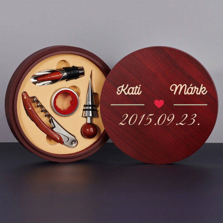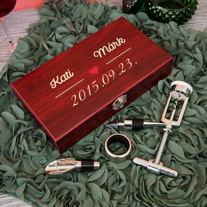 Szép, 4 részes borkészlet elegáns fadobozban gravírozott fedéllel.Két opció közül lehet választani:
