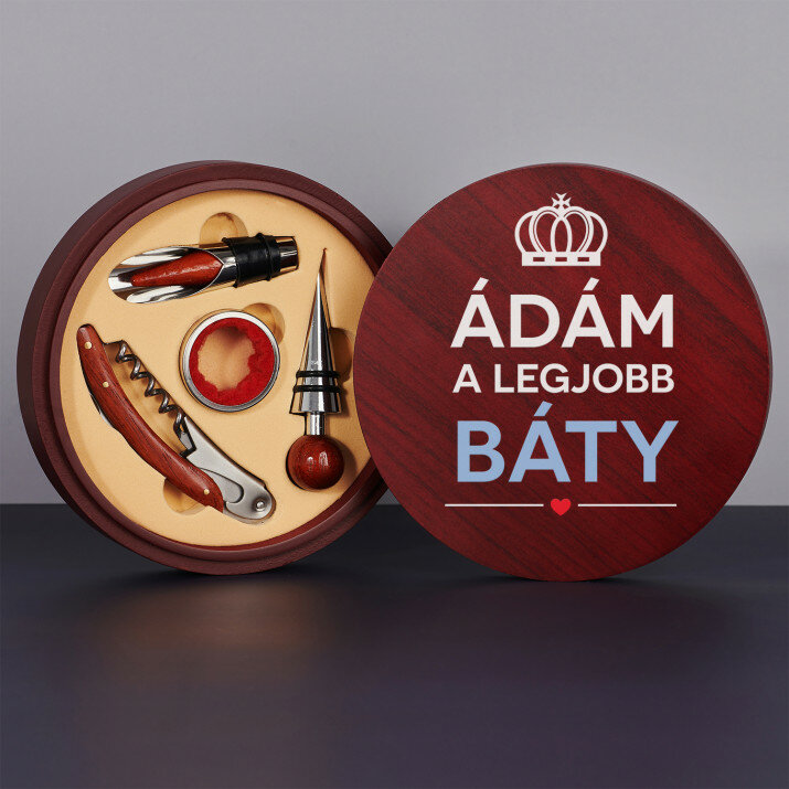 Szép, 4 részes borkészlet elegáns fadobozban gravírozott fedéllel.Két opció közül lehet választani: