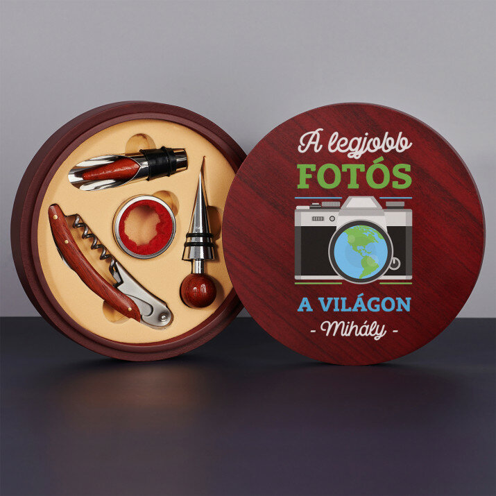 Szép, 4 részes borkészlet elegáns fadobozban gravírozott fedéllel.Két opció közül lehet választani: