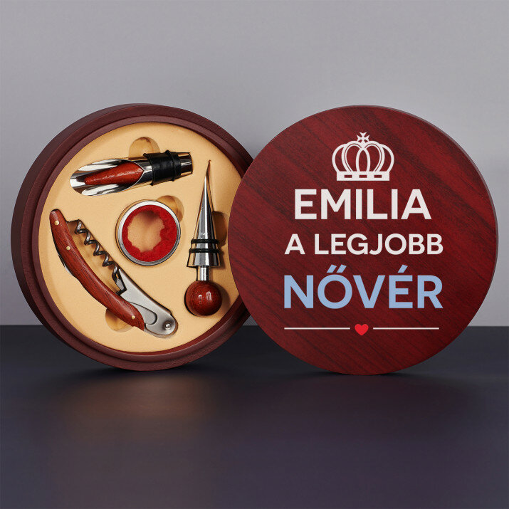 Szép, 4 részes borkészlet elegáns fadobozban gravírozott fedéllel.Két opció közül lehet választani: