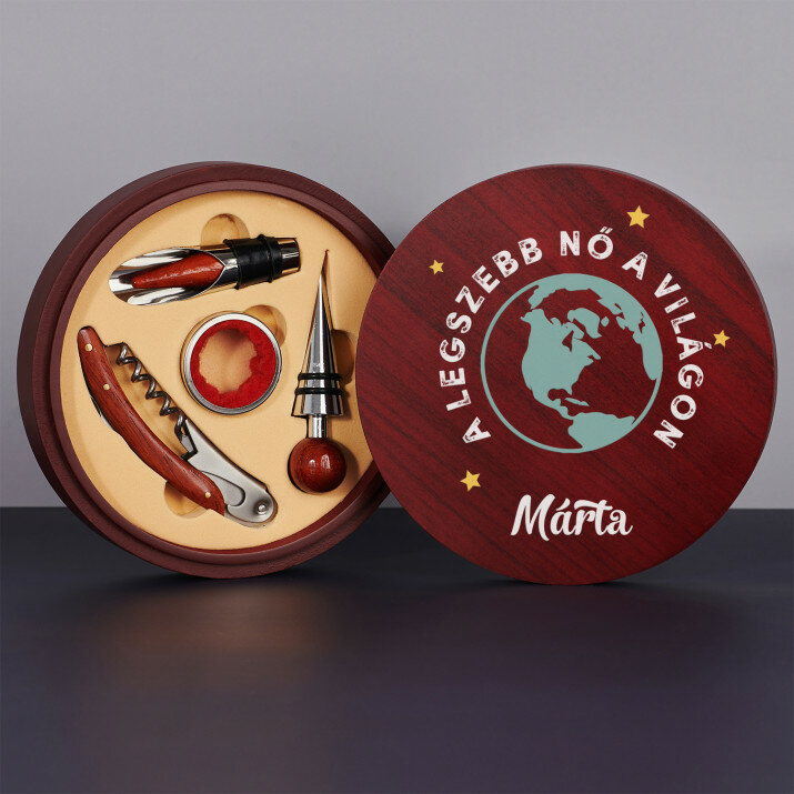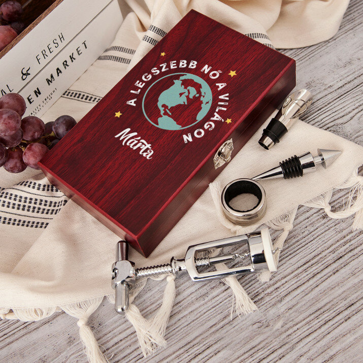Szép, 4 részes borkészlet elegáns fadobozban gravírozott fedéllel.Két opció közül lehet választani: