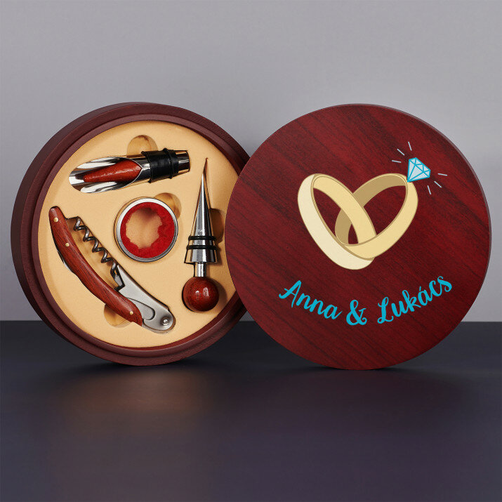 Szép, 4 részes borkészlet elegáns fadobozban gravírozott fedéllel.Két opció közül lehet választani: