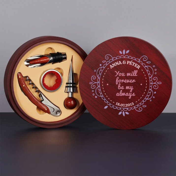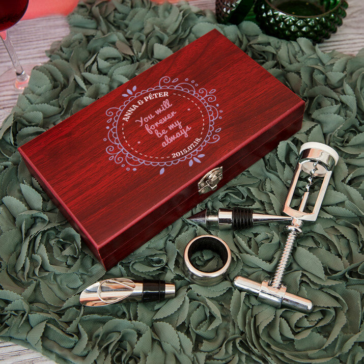 Szép, 4 részes borkészlet elegáns fadobozban gravírozott fedéllel.Két opció közül lehet választani: