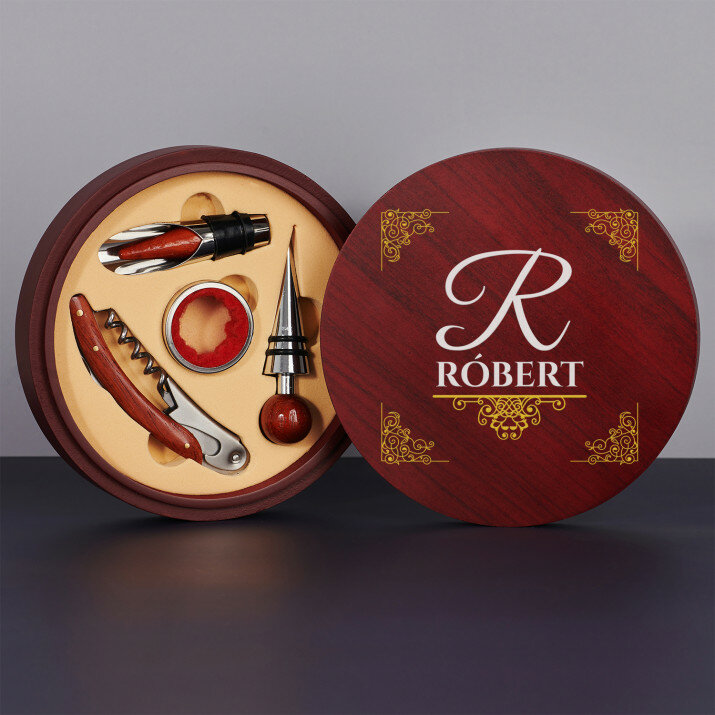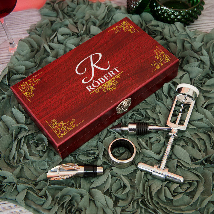 Szép, 4 részes borkészlet elegáns fadobozban gravírozott fedéllel.Két opció közül lehet választani: