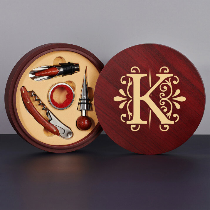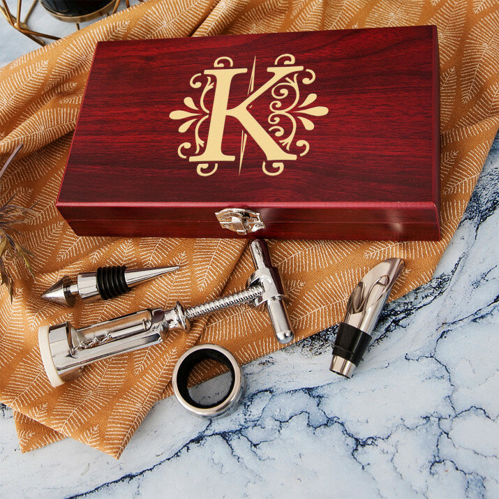 Szép, 4 részes borkészlet elegáns fadobozban gravírozott fedéllel.Két opció közül lehet választani: