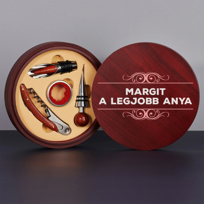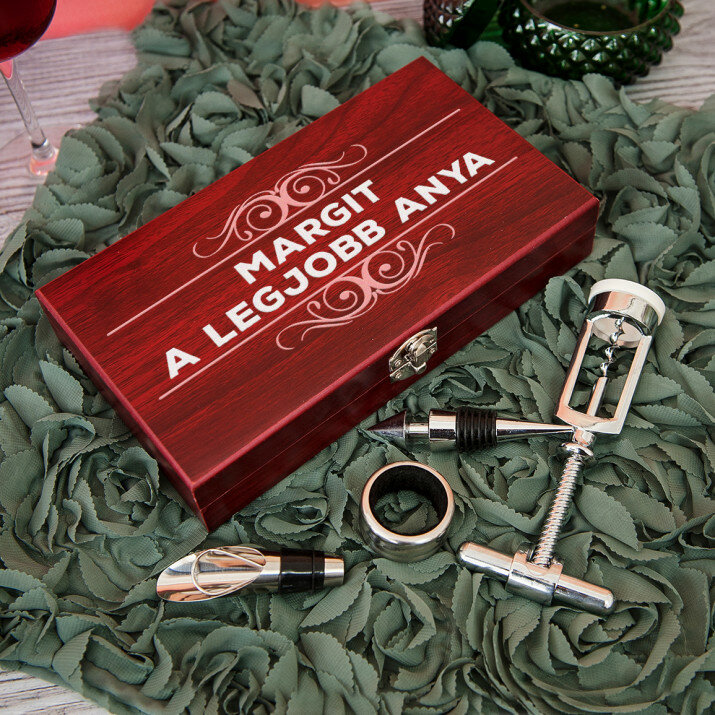 Szép, 4 részes borkészlet elegáns fadobozban gravírozott fedéllel.Két opció közül lehet választani:
