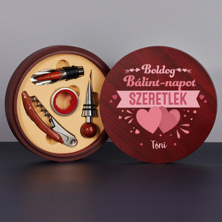 Szép, 4 részes borkészlet elegáns fadobozban gravírozott fedéllel.Két opció közül lehet választani: