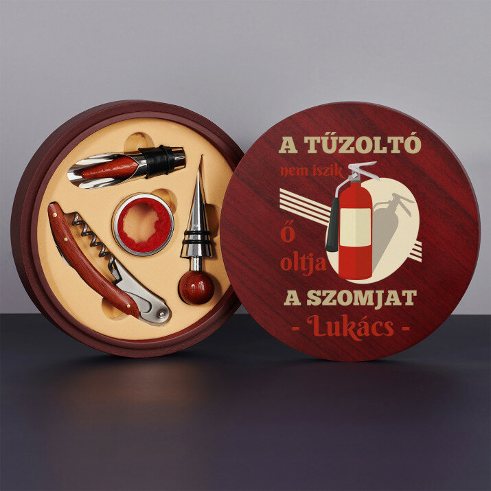 Szép, 4 részes borkészlet elegáns fadobozban gravírozott fedéllel.Két opció közül lehet választani: