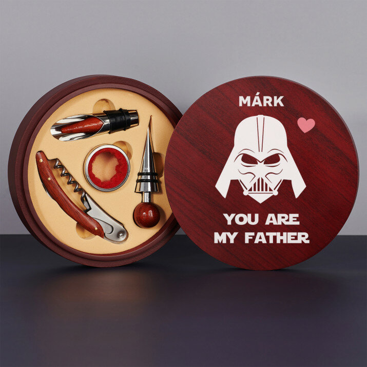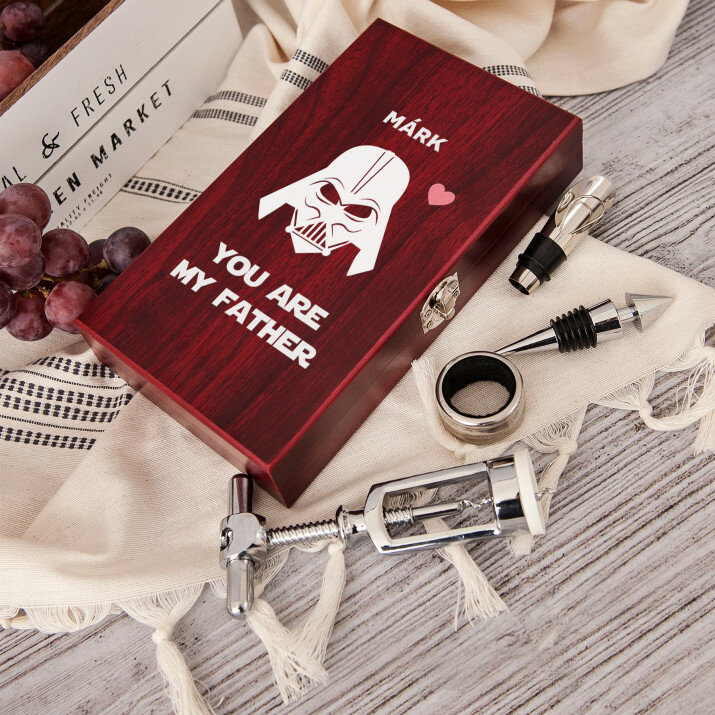 Szép, 4 részes borkészlet elegáns fadobozban gravírozott fedéllel.Két opció közül lehet választani:
