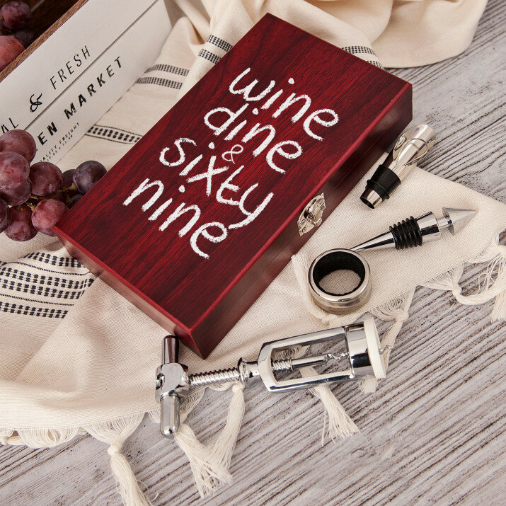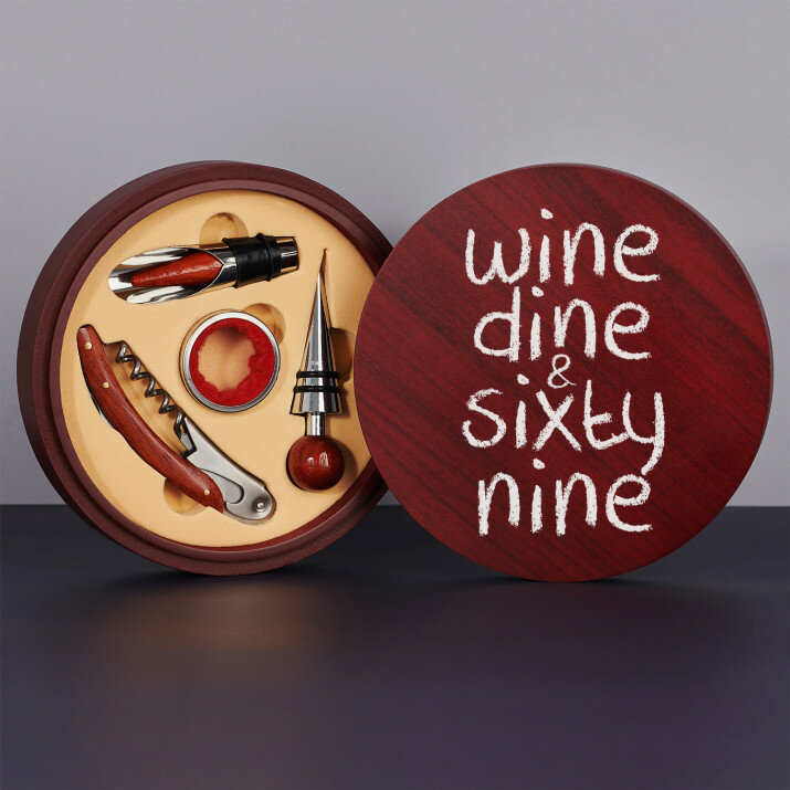 Szép, 4 részes borkészlet elegáns fadobozban gravírozott fedéllel.Két opció közül lehet választani: