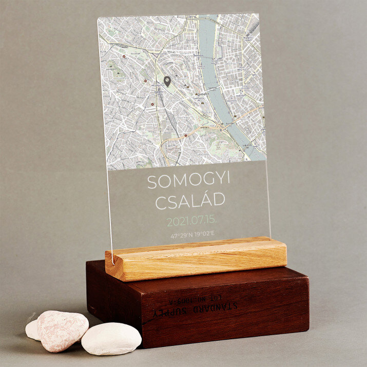 Néha csak be kell hunynunk a szemünket, hogy olyan helyekre utazhassunk, amelyek sokat jelentenek számunkra. Ezeket általában egy szerettünkkel, családunkkal vagy barátainkkal osztjuk meg. Különleges és fontos pillanatok jutnak akkor eszünkbe. Ezeket a közös emlékeket szimbolikusan egy olyan szokatlan ajándékba lehet áttenni, amely örömet okoz a szerettünknek.Az általad megadott elhelyezkedésnek köszönhetően ez az akrilüveg nyomtatás ideális esküvői, házassági évfordulós, illetve Bálint-napi ajándék. Tökéletes emlék lesz a barátaid számára is. Az általad kiválasztott helyszín (egy vagy több - a dizájntól függően), a személyre szabott elemekkel kiegészítve rendkívül elegánsan néz ki. Ez tényleg egyedi ajándék!