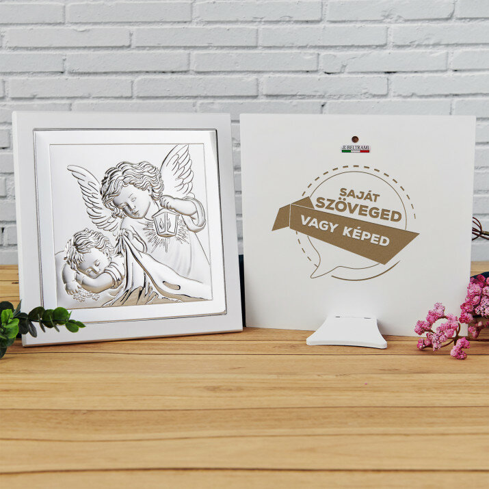 16 x 16 cm-es, ezüsttel laminált kép. A külső ezüst réteget speciális védőlakkal védték. A kép hátoldala kiváló minőségű fából készült. A mellékelt lábnak köszönhetően felakasztható vagy állítható. A termék gyártója egy neves olasz cég, és az eredeti céges dobozban van csomagolva. A képnek eredetiségigazolása van.GRAVÍROZÁS