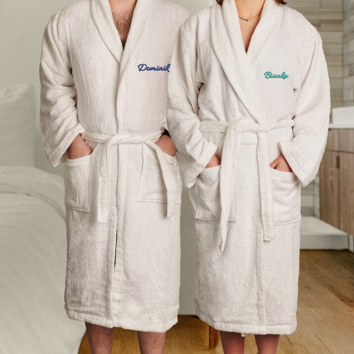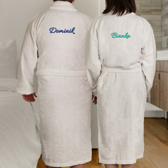 Két univerzális fürdőköpeny fehér színben, 100% pamut frottírból készült. Kényelmes, szép, puha - tökéletes kényelmet nyújt, amikor egy nehéz nap után itt az ideje a pihenésnek. Ébredés után, ha felvesszük rögtön felmelegít. A fürdőköpeny csodaszép egyedi hímzéssel díszítve, javítja a közérzetet, mindezek a fürdőköpenyt még különlegesebb ajándékká teszik!